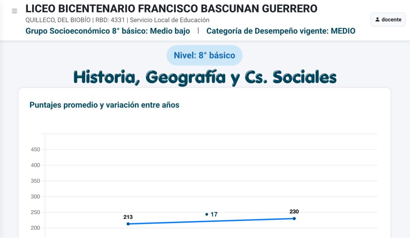 En 8° año de Educación General Básica, en la asignatura de Historia, se obtuvo un puntaje de 230 puntos, lo que significa +17 puntos respecto a la última medición realizada en 2019 para este nivel.